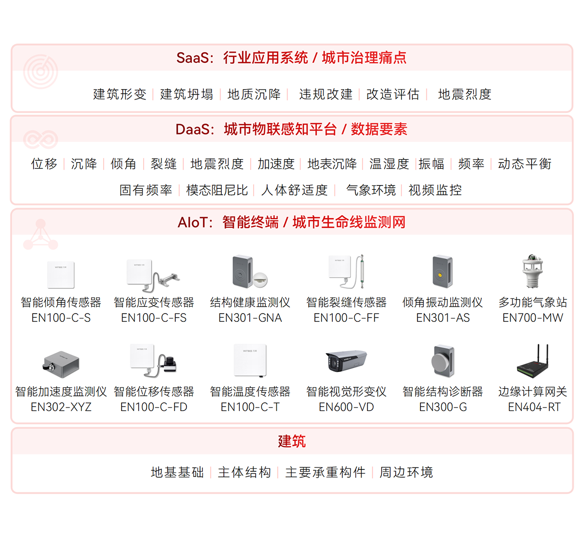 實時監(jiān)控建筑結(jié)構(gòu)健康狀態(tài),通過位移、沉降、傾斜、溫濕度、裂縫和動態(tài)平衡、自振頻率的數(shù)據(jù)收集分析,對潛在災害進行提前預警,對突發(fā)事件應急報警,為結(jié)構(gòu)坍塌監(jiān)測預警分析和滑坡監(jiān)測預警分析提供數(shù)據(jù)支撐,實現(xiàn)對建筑健康狀態(tài)的實時評估。